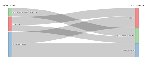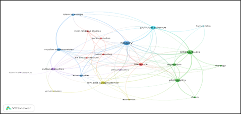 Network analysis is rich and depicts the global collaboration of scholars across 150 countries to confirm the field’s international scope. The evolving research themes reveal both the continuity of classical and the emergence of novel themes, consistently both in articles and books. This unity in research themes underscores the interplay between these two scholarly mediums. However, the geographic analysis identifies UK as the key contributor to the Islamic studies, possibly due to the increased interest of the researchers sharing the geographical affiliation of OJIS.
