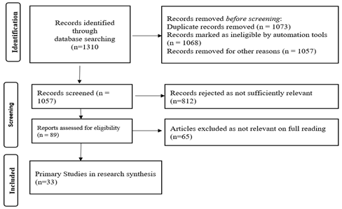 The systematic literature review followed a structured process of identifying high-quality and relevant studies on the evolution of Islamic historiography and its interaction with modernity. Extracted records (n = 1,310) through Scopus and ISI Web of Science were included at the identification stage. Thus, after removing duplicate records (n = 1,073) and entries maintained as ineligible by automation tools (n = 1,068), only 1,057 records were available for screening.