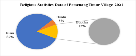This research focuses on religious cohesion in Pemenang Timur Village, located in Pemenang Sub District, about 9 km from the center of Lombok Utara Regency. This area is well-known for its religion diversity, including Muslims, Buddhists, and Hindus, living adjacently in one region. The people of Pemenang Timur Village exhibit a lifestyle that emphasizes harmony and cooperation among religious communities, as indicated by social activities such as mutual assistance and cooperation in constructing worship places. The daily life in this village reflects good communication between religious communities, based on the values of togetherness and mutual respect. The number of religious adherents according to statistic data of Pemenang Timur Village in 2021 is presented in the figure below.