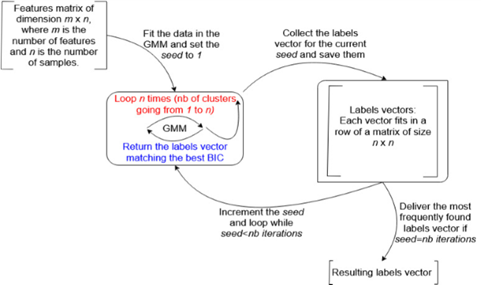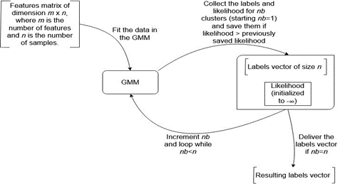 Given the promising advantages of the spectral clustering in the aforementioned tools [4, 24], the study's approach is to exploit the parameters of the state-of-the-art GMM implementations, to fine-tune the produced clusterings and improve their quality. Four approaches to automatically select the most relevant clustering based on given criteria are presented in this section. The first algorithm consists of maximizing the GMM likelihood. This is achieved by performing several iterations as illustrated in Figure 1.