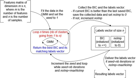 The fourth algorithm shares some aspects of similarity with the third one. It successively clusters the sequences using different seeds, but just keeps in memory the designated best clustering (for example, the one that scores the best BIC). Moreover, in order to reduce the execution time of this algorithm, an additional parameter, called noImp, is defined to count the number of iterations made without detecting any improvement and stop the iterative process before reaching the chosen number of iterations (nb iterations). For example, the iterative process is terminated if no BIC improvement is detected after a user-defined maxNoImp number of consecutive iterations (noImp=maxNoImp).
