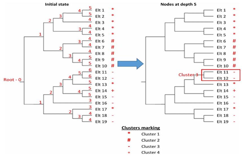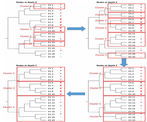 At the second iteration with inner nodes of depth , three new clusters are created. The first one consists of Elt 1 and Elt 2 and is labeled as "Cluster 1" because both of its sequences belong to the first cluster. The second cluster is created in the same way as the previous one. The third new cluster consists of Elt 14 and Elt 15 which belong to different clusters and thus, there is no dominant label in this cluster. For this reason, the third identified cluster is labeled as "Undefined". It can also be noticed that Elt 3 was added to "Cluster 3" and the label of this cluster is preserved since the dominant label among its elements did not change. Figure 5 displays the next three iterations and then the iterative process stops at the root node depth . In this scenario, the resulting reference clustering consists of three clusters. The first two are homogeneous but the third one contains sequences belonging to three different clusters in the given clustering. However, six of its nine sequences belong to the same cluster and thus, their dominant label is assigned to this cluster.