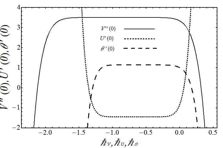 It is observed that the convergence of the considered problem equations (38)-(40) is based on the auxiliary parameters ℏV,ℏU "and" ℏθ, where ℏV,ℏU "and" ℏθ are chosen in a manner that these three series become convergent at Then, eqs (47)-(49) give the following results.