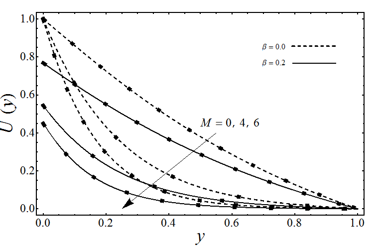Figure 3 is drawn to show the detailed comparison for two different values of slip parameter β for velocity field U(y) and for the chosen points of the magnetic parameter and slip parameter β, putting Re = 1. The figure describes that magnetic field behaves like a retarding force for velocity. In contrast, Figure 4 shows that by means of both solution techniques the magnetic field reduces the normal velocity. Whereas, the reverse situation is observed for discrete values of the slip parameter
