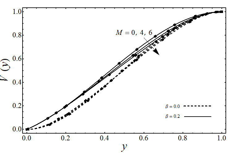 The accuracy of HAM and numerical solution is depicted in Figure 5 for V'(y) , for different values of the magnetic parameter M, and for the two fixed values of β. It is evident from this figure that for β = 0 and for the modest values of M, the viscosity influences the induction drag and V'(y) is nearly parabolic for M = 0. For higher values of M, the viscosity remains uncritical and its influence is bound to a thin boundary layer near the wall. For β = 0.2 and by increasing the value of M, the maximum velocity point is moved over to the solid wall and its value is increased.