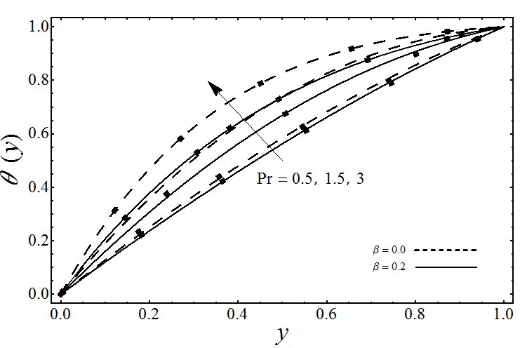 Figure 7. Analysis of numerical solution (filled square) and HAM solution (solid and dashed lines) for θ(y) and for various points of slip parameter β and Prandtl number Pr when Re = 1, M = 1.5, Nr = 0.1, and E = 1.