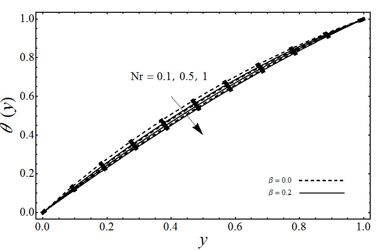 5.1. ConclusionA comparative study of numerical and analytical solutions is presented through graphs. The comparisons of analytical and numerical solutions are found to be in excellent agreement. The study shows that due to an increase in the values of M and β, a decrease is observed in U(y),V(y) and θ(y) whereas an increase is noticed forV'(y) . An increase in temperature is noted for large values of Pr and β but the situation no longer remains the same in the case of Nr.