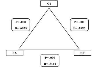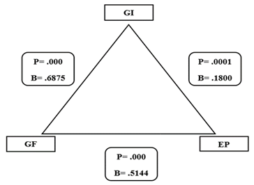 As per the results shown in Figure 3, all three relationships, i.e., GF-EP, GF-GI, and GI-EP, are found to be statistically significant. This suggests that green innovation partially mediates the relationship between green finance and environmental performance. Hence, the banks providing green financing options also foster a mindset of innovative green financial products and services. This improves their environmental performance by reducing their ecological footprint. However, the relationship between GF and EP also holds statistically significant even in the absence of GI. This underscores the dual significant impact where green finance drives environmental performance, both directly and indirectly.