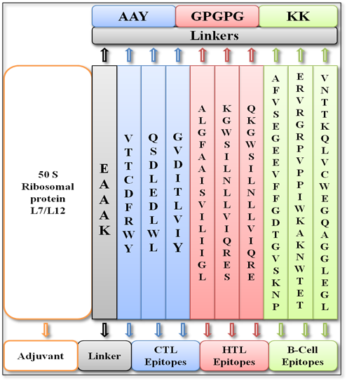 This research project applied Computational algorithms to predict three types of epitopes including linear B-cell along with HTL and CTL. The selection of CTL and HTL epitopes began because they connect with sufficient HLA alleles for future examination. The selected CTL epitope together with HTL epitope and linear B cell epitope demonstrates both effective antigenicity and determination while also showing non-toxicity and non-allergenicity to vaccine candidates. Several immunoinformatics methods performed the analysis to evaluate the epitopes [81]. Several linkers were used to combine epitopes with different pattern types in the essential components of the vaccine. The physicochemical abilities including stability analysis show that AAY, GPGPG and KK links work effectively to combine B-cell linear epitopes CTL and HTL with each other. The vaccine researchers chose to add the 50S ribosomal proteins L7/L12 adjuvant as well as an adjuvant and 3 CTL epitopes, three in HTL epitopes, all 3 B-cell epitopes, one linker EAAAK, two linkers AAY, three linkers GPGPG, and three KK linkers to the original vaccine's 294 amino acids from the beginning of the amino terminus. The rigid EAAAK linker establishes helix structure elements that boost immunogenic properties as noted by [81, 82]. Several elastic and flexible amino acids integrate within the linkers GPGPG, AAY, and KK resulting in avoidance of area separation [82, 83].