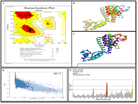 Figure 4. (A) Ramachandran Plot Illustrating the Stereochemical Quality of the Vaccine Model. (B) The Initial 3D Structure of the Vaccine Construct using the Robetta Server. (C) Refined 3D Structure of the Vaccine Model Obtained After Optimization with the GalaxyRefine Websites. (D) ProSA-web Z-score Plot Assessing the Overall Quality of the Refined Model. (E) ERRAT Quality Factor Plot Indicating the Reliability of the Predicted Structure Based on Non-bonded Atomic Interactions
