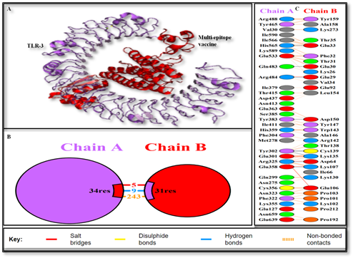 The capability of ligand-receptor molecular interactions was assessed through the application of molecular docking in order to determine complex bindings strength and stability. Molecular docking centered on Toll-like receptor 3 because it functions as the vital element to activate immune response and detect infections. The vaccine binds with Chain-A of TLR-3 receptor at the HDOCK server PDB ID: (1ZIW). The vaccine demonstrates strong receptor binding with TLR-3 because of its high affinity but we chose the docking model with the negative energy score of -266.16 [40, 44, 59, 62, 67] (see Table 10). The PDBsum server identified 243 non-bonded contacts and detected 05 salt bridges together with 09 hydrogen bonds during the docked complex interaction analysis. The binding mechanism of the complexes was assessed by PyMOL and revealed through Figure 6.