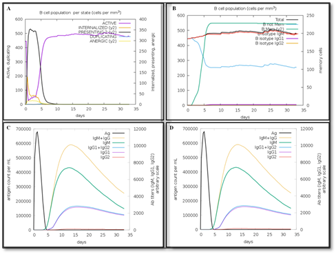 Figure 9. Simulated Immune Responses (A) The number of active B cells. (B) Total number of Memory Cells, Immunoglobulin, and B cells. (C) Immunoglobulins and Antigens. Antibodies are Categorized into Isotype Groups. (D) CD4 T-helper Lymphocytes May be Separated into Active, Resting, Anergic, and Replicating Entity-states.