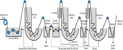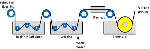During the pre-treating, all the impurities with negative effects on dyeing and printing are washed. De-sizing, scouring, and bleaching, enabling smoother processes of dyeing and softening, are undertaken. But differences in pre-treating processes of de-sizing, scouring, and bleaching can significantly reduce the quality of the product, producing uneven color and lower fastness, dyeing process is represented by Figure 3.