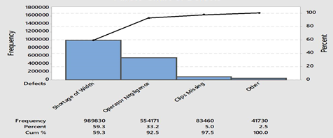A. ANALSISMinimizing defects is crucial for ensuring product quality. Producing high-quality products is essential to remain competitive in the global market. This study adopts the Lean Six Sigma methodology to identify the major defects, analyze their root causes, and propose effective solutions to minimize these defects. By effectively utilizing the techniques of Six Sigma, key issues are identified, and wastage, and its impacts, are minimized [15]. This directly contributes towards quality and production efficiency improvement, reducing production delays, reducing usage of chemicals, reducing usage of utilities, and ultimately, customer satisfaction.