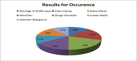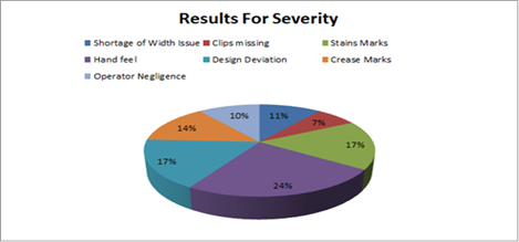 Highest: Stain Marks (RPN = 315) → critical issue. then Hand Feel (RPN = 196), Shortage of Width (162), Clips Missing (144) to Lowest: Operator Negligence (15). This ranking is important for prioritizing corrective actions.