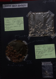 In this phase, various available raw materials necessary to create bioplastics were collected, and the study began with experimentation with recipes available in online resources for bioplastics, leading to experimentation with combinations of these recipes and further development. Employed in this study is a simple process, utilizing basic equipment. Each sample's recipes, results, and observations were recorded alongside the sample. Furthermore, for each basic recipe, multiple experiments were done, including changes in the composition, using additives, and adding variety in the molds used to cast the sheets.