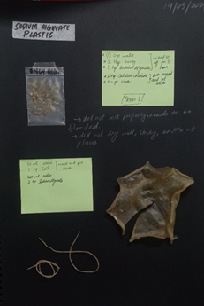 FIGURE 3. Sample # 3, showing experimentation with varied compositions of sodium alginate bioplastic, including yarn made from it.