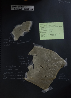 FIGURE 2. Sample # 2 showing experimentation with gelatine-based bioplastic by varying composition and testing impact of water on it.