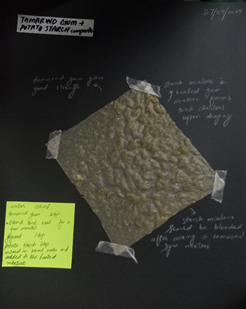 This material was formed by blending the tamarind gum in water and heating it on a medium flame. Potato starch and glycerol were added to it as a separate mixture formed in water. This mixture did not dissolve well in the tamarind gum and formed clumps of starch. Upon drying, it resulted in a strong but uneven material. The clumps of potato starch become solid, while the tamarind gum resulted in a yellowish translucent flexible sheet.