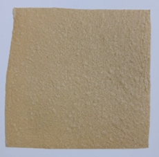 In sample # 3, shown in Figure 3, it was observed that sodium alginate bio-plastic has very high shrinkage on its own while drying. Thus, addition of filler material in it has to serve the purpose of reducing shrinkage alongside adding to the strength and structure of the material. For this purpose, in tryout 1 shown in Figure 11, after preparing the sodium alginate mixture as described above in Figure 3, dried, powdered, and sifted wheat crop wastes were incorporated, and the mixture was later spread in a mold and left to dry. This resulted in a cork-like textured sheet, which formed well but lacked strength.