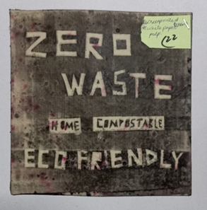 FIGURE 1. Sample # 1 showing experimentation with cornstarch bioplastics, including tryouts with and without textures, colors, and impact of water on it